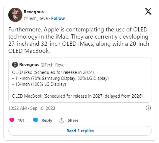 音讯源 @Tech_Reve 近来泄漏,苹果公司正在测验 27 英寸和 32 英寸的 OLED 面板,有望应用于下一代 iMac 设备上。
