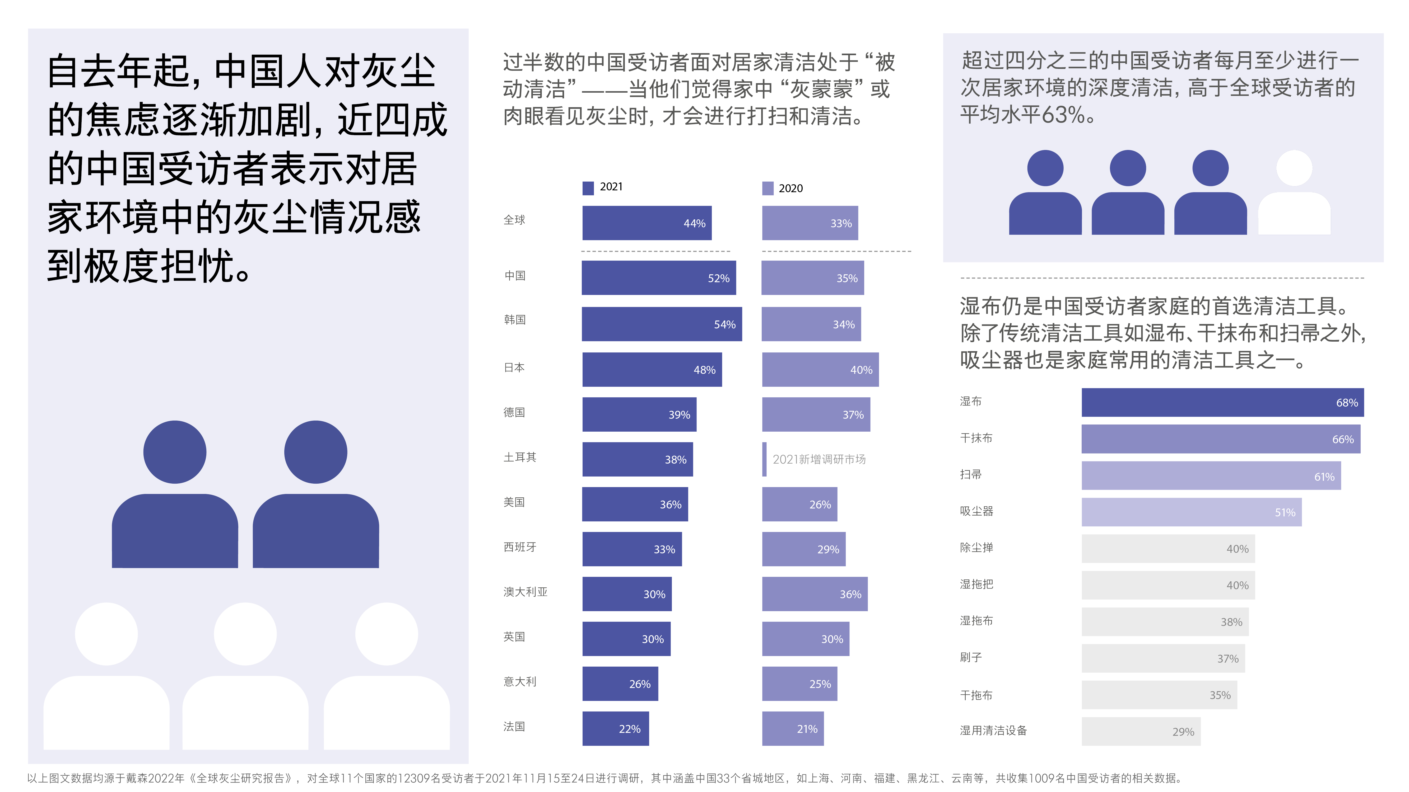 每一项新品面世之前,戴森会做长时间很多的顾客研讨,力求充沛了解世界各地顾客的需求。以戴森2022年最新发布的《全球尘埃研讨陈述》为例,陈述提醒过半我国受访者在肉眼看到尘埃时才会清扫清洁,在日常居家清洁中处于“被迫清洁”的状况。这一误区却或许带来不小的危险——许多尘埃颗粒的巨细是仅显微镜可见的,当人们在家中发现显着的尘埃时,尘螨很或许早就在家中处处暴虐。正是根据这一顾客洞悉,戴森才会大力研制可视化技能,让顾客更好地发现肉眼不行见的尘埃。